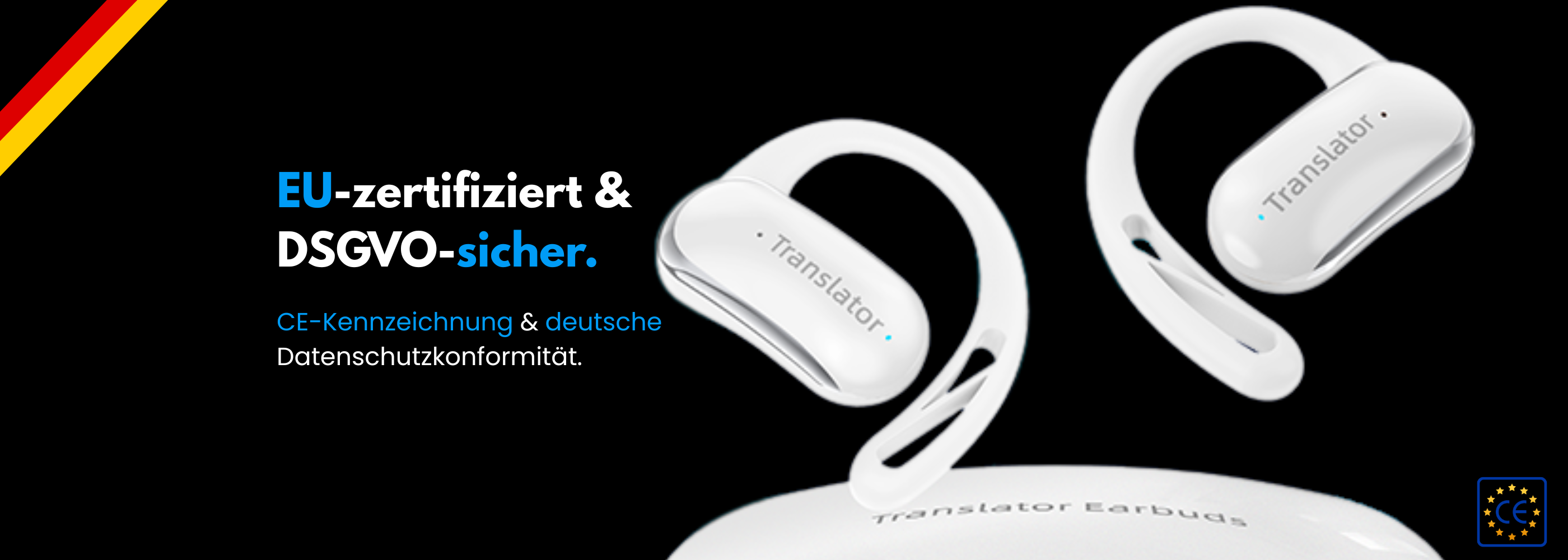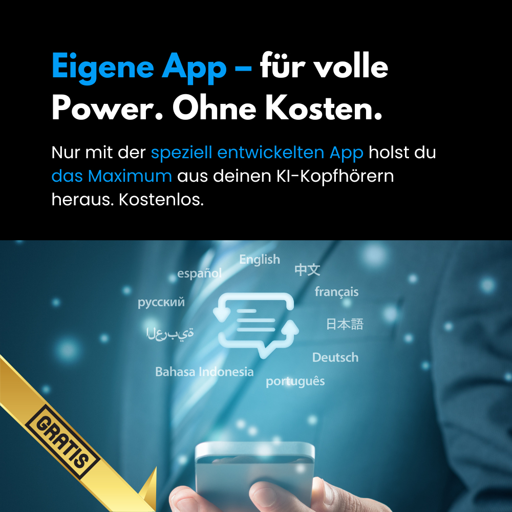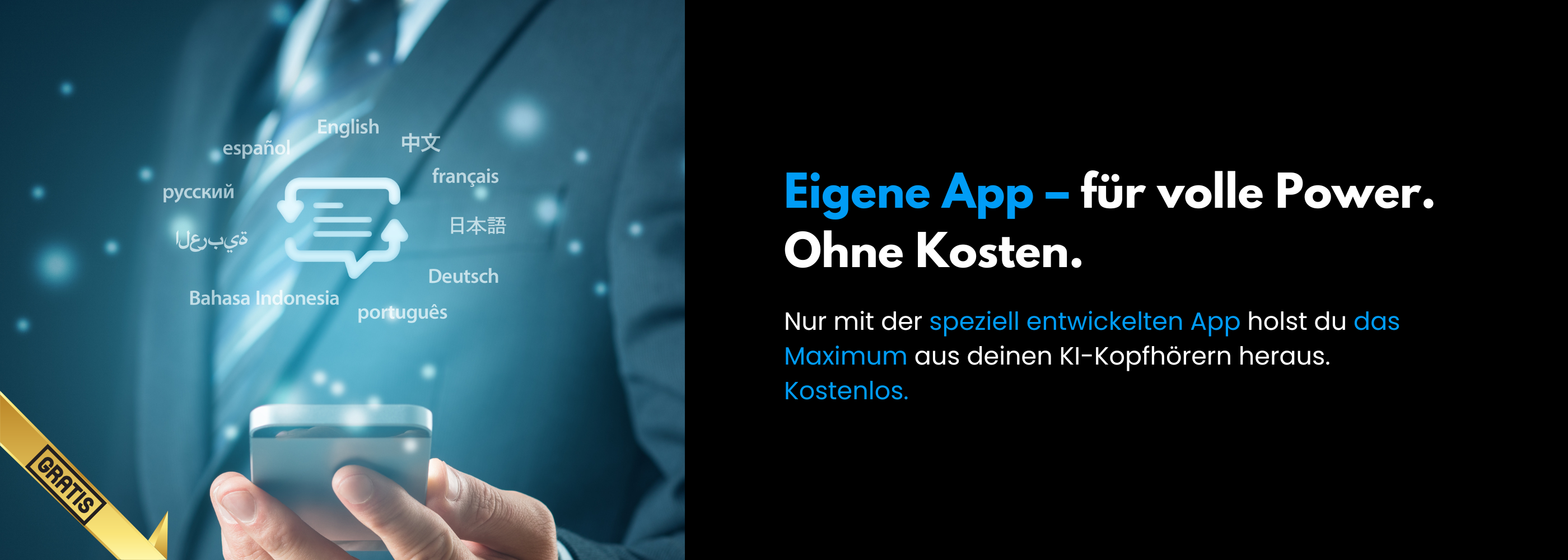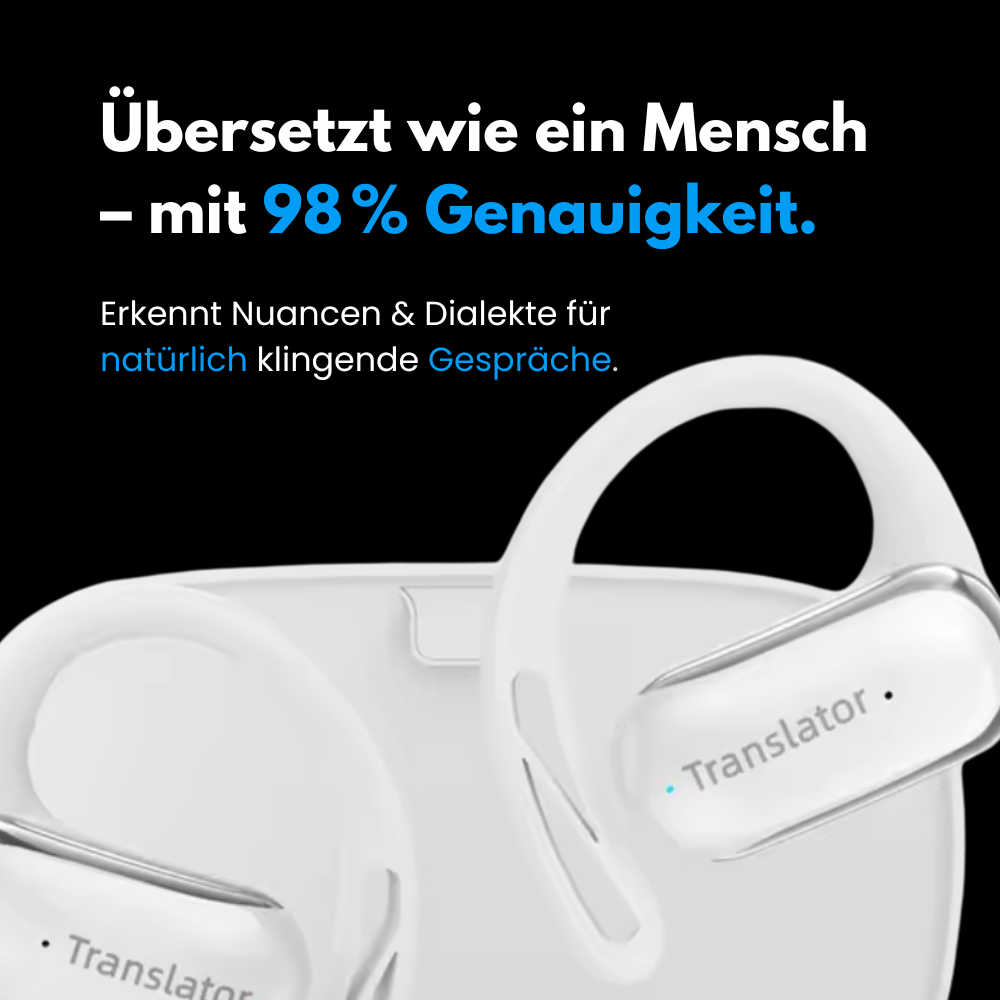 Bitte beachte: Die Übersetzung erfolgt in Echtzeit, jedoch mit einer kleinen Verzögerung (einige Sekunden). Das liegt daran, dass der Ton zunächst erfasst, per KI verarbeitet und dann übersetzt ausgegeben wird. So funktionieren alle Kopfhörer mit KI-Übersetzung.